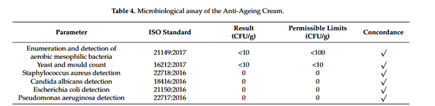 In this study, the results confirmed an acceptable cosmetic product with an optimal appearance and suitable physicochemical properties, according to the stability test and physicochemical properties. Microbiological control, including the effectiveness test of the preservative used (challenge test), was also confirmed for the developed formulation.